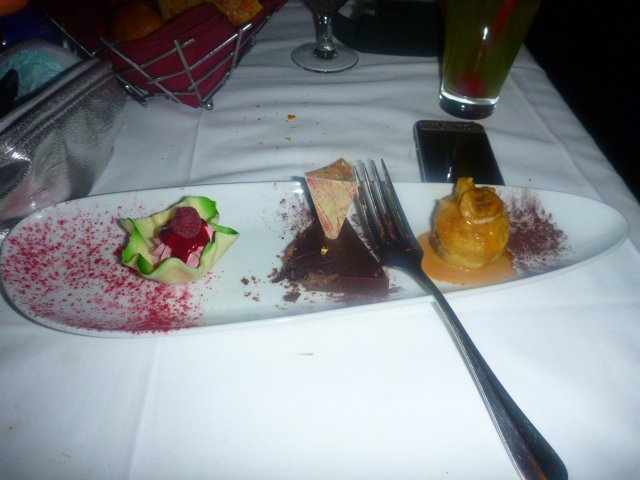 Having not eaten at lunch (time-to make room for the dinner) 2 for 1 martinis at level 107 bar whilst we waited for a window seat (since they dont automatically reserve you one) was a mistake. I recommend either arriving early if you are particular about being seated by a window (as we were), or not over indulging on an empty stomach if you want to get the most out of this beautiful food. We were both more than slightly tipsy, which was a shame, as I would like to have been fully present in the experience of enjoying the amazing food, including this rather beautiful dessert. I enjoyed the raspberry mouse in the white chocolate cup and the chocolate triangles but was not a fan of the banana dessert to the right of the dish.